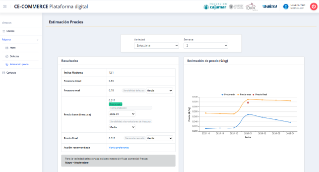 Los resultados generados por el modelo se integran en una plataforma digital, donde los usuarios pueden visualizar la evolución de la frescura, los rangos de decisión comercial, los precios estimados bajo distintos escenarios de demanda y la información necesaria para optimizar la gestión del producto, reduciendo pérdidas y mejorando la rentabilidad de la cadena de valor citrícola.
